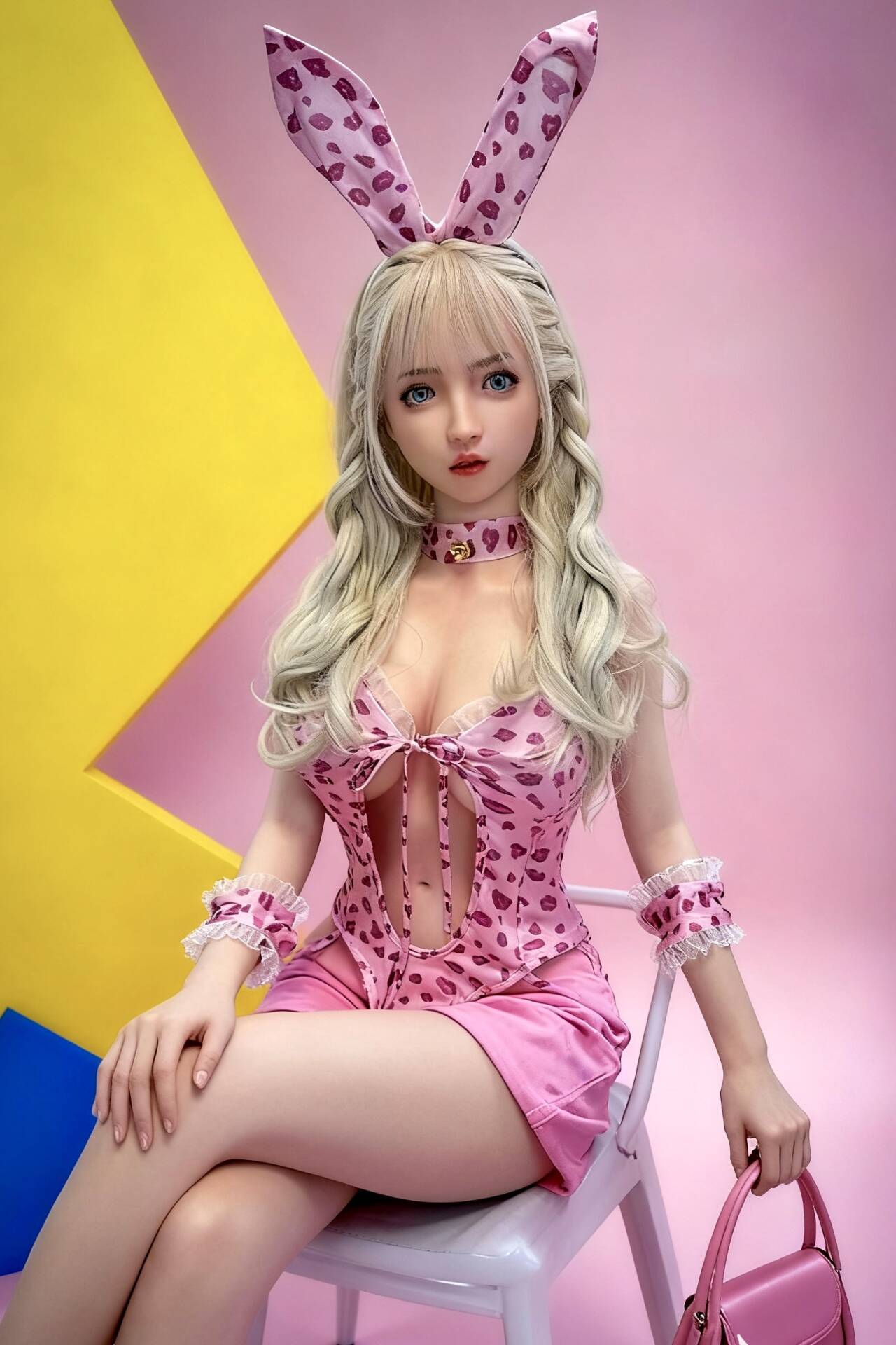 Anna's outfit is a masterpiece of sweet playfulness with just the right touch of allure. She wears a pink bodysuit with heart-shaped leopard patterns that adds a playful yet sophisticated touch to her bunny girl aesthetic. The matching rabbit ear headband completes the adorable look, while the coordinating collar and lace-trimmed wrist accessories add delicate detail. The figure-hugging one-piece features a crop top design and high-slit cut that playfully reveals her graceful form, finished with the perfect bunny tail accessory. This isn't just cosplay—it's a carefully crafted expression of sweet, playful femininity.